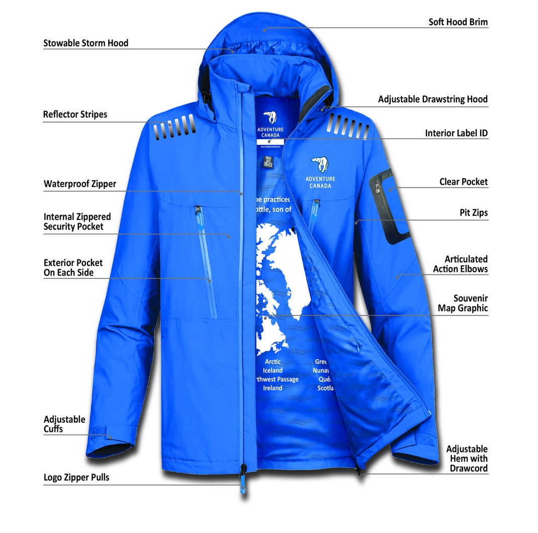 Polar fashionistas wait no longer ... the new Adventure jacket is on board! Sashaying down the gangway is the latest in polar expedition wear designed exclusively for your company. Azure Blue sets the theme for your ocean-going adventure, with a higher waterproof membrane rating of 10,000 mm and an 8,000 mm breathability factor built in. Just right for extended shore excursions or a splashy zodiac ride. Also new this year are "pit zips," allowing for improved air circulation and a brilliant clear shoulder pocket that holds your shipboard ID bar code-freeing up your hands when being scanned off and on the ship-a fabulous time saver! Reflective safety stripes accent the jacket exterior, while the interior features a bold graphic map of your amazing destinations! The top interior label has room for your name, making jacket ID instantaneous. Custom zipper pulls feature YOUR logo, setting the theme for exciting expedition travel. An internal zippered security pocket, articulated action elbows an adjustable drawstring stowable storm hood - make this comfortable jacket one you will enjoy on onboard and at home!